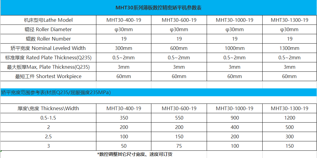 MHT30數控高精密矯平機/校平設備/整平機,可用于鋼板,不銹鋼,銅板,鋁板,網孔板等材料,可根據客戶不同材料要求定制生產。目前成熟現貨產品寬度有0.4M,0.6M,1.0M,1.3M可選擇。金屬材料在較大彈塑性彎曲條件下,不管其原始彎曲程度有多大區別,數控精密矯平機利用材料的“包辛格效應”對板材進行多次反復彎曲,逐漸減小壓彎撓度,使多種原始曲率逐步變為單一曲率,并將其矯平,達到工藝要求的平整精度。
